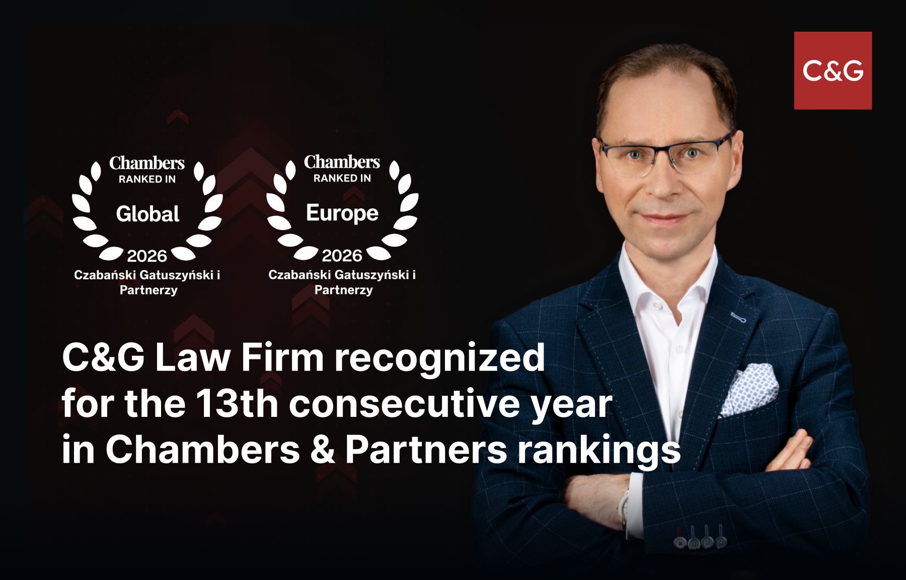 C&G Law Firm has been recognised in the latest Chambers and Partners 2026 rankings. This marks the 13th consecutive year of our presence in this prestigious guide. We have been ranked in the Banking & Finance category in both the Global and Europe rankings. Piotr Gałuszyński, Partner at C&G Law Firm, has also been included in the Europe Guide 2026 and the Global Guide 2026.
